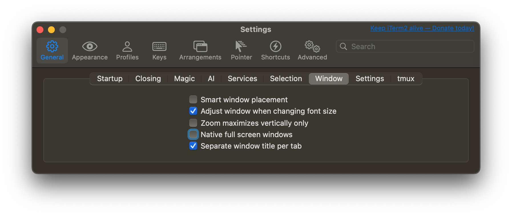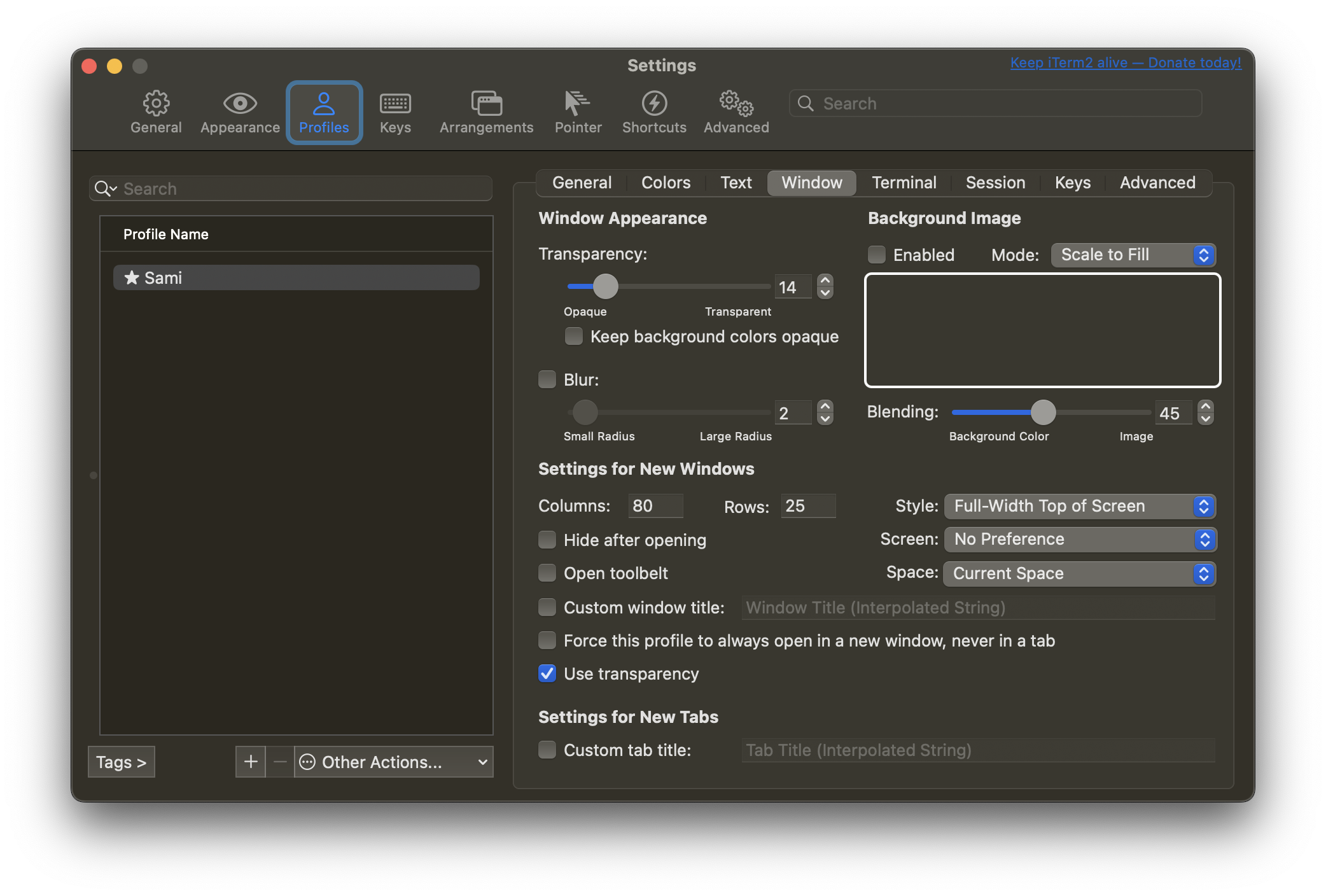 - Profiles -> Window