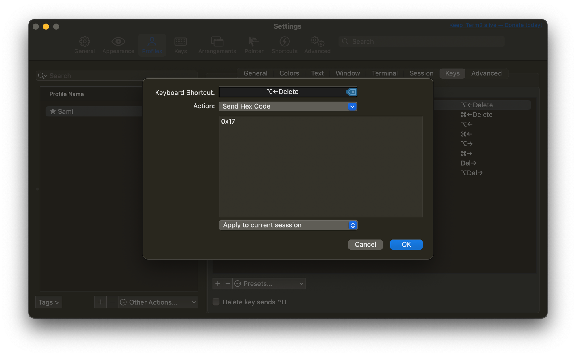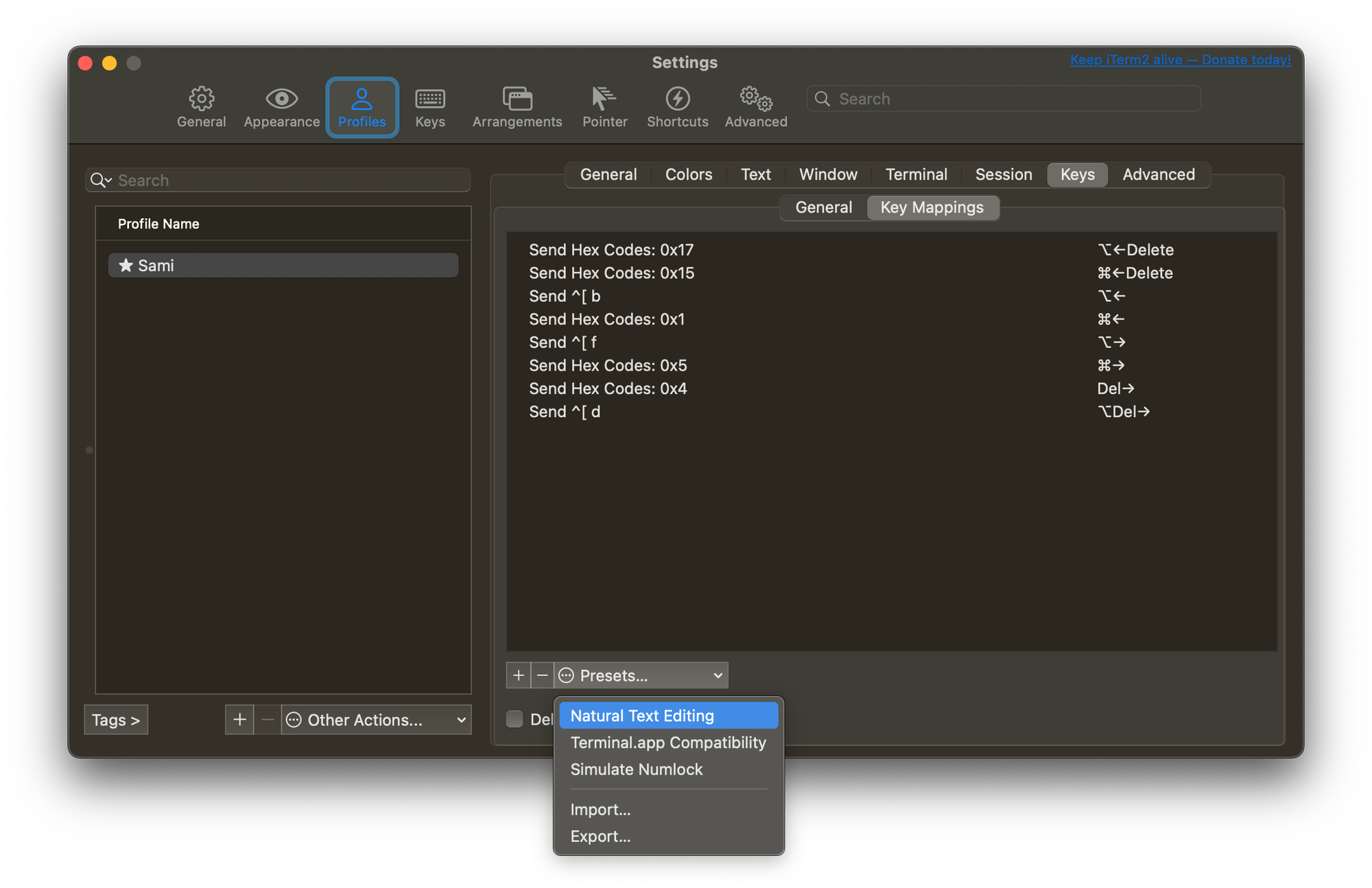 - Profiles -> Keys -> Key Mappings