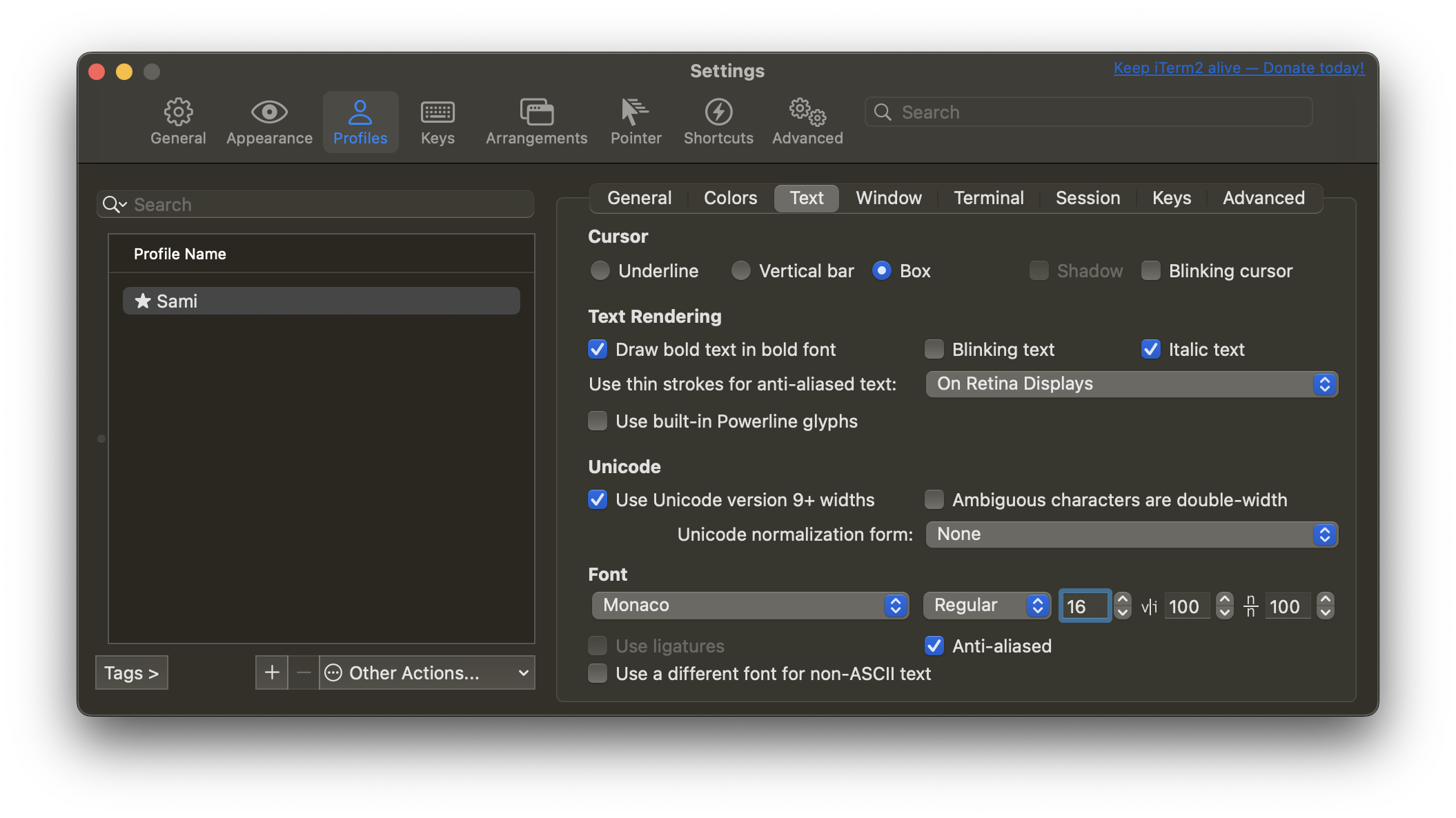 - Profile -> Text -> Font "16"