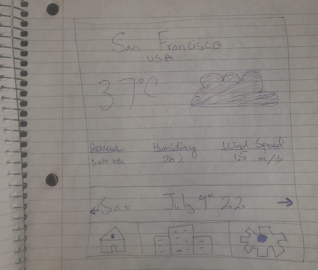 To accomplish this I decided to be a bit more ambitious for the reference project: not just have a skeleton of a project, but a working app within it, as well as debug friendly developer tools such as a design system catalog viewer, theming viewer, date utilities, and more. The smallest of apps I could think of that requires networking, and possibly db for caching, was non-other than a weather app. I checked out existing apps out there, and began to draft out a prototype on paper: