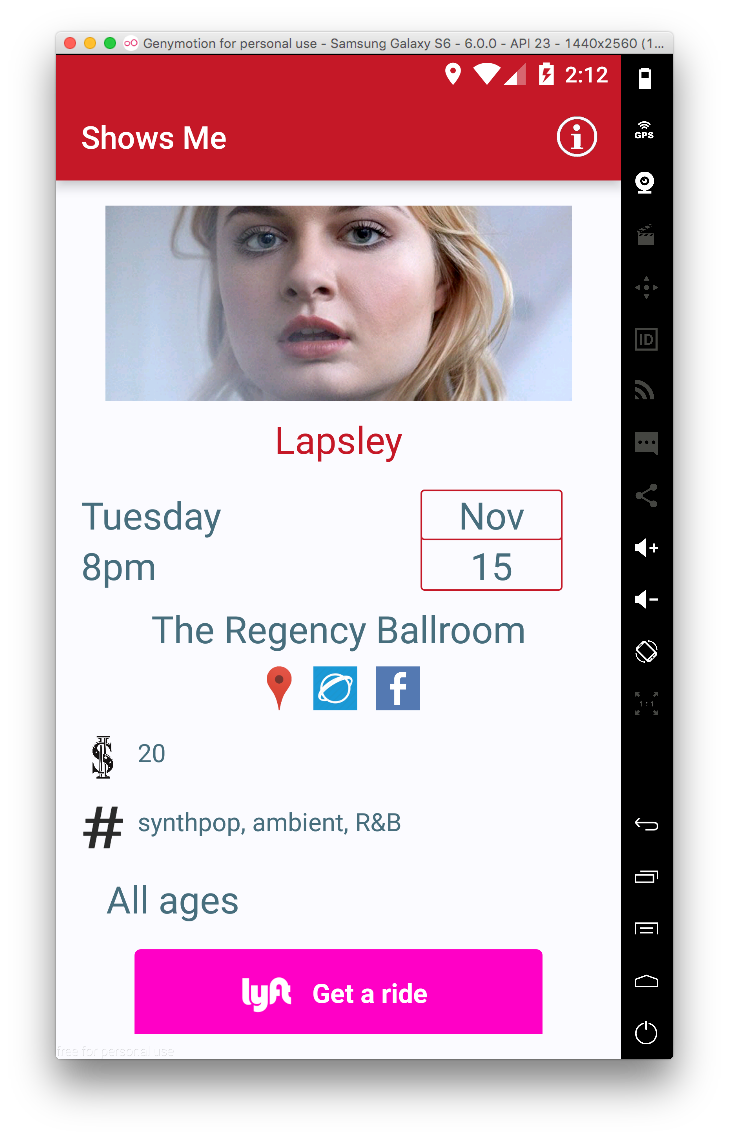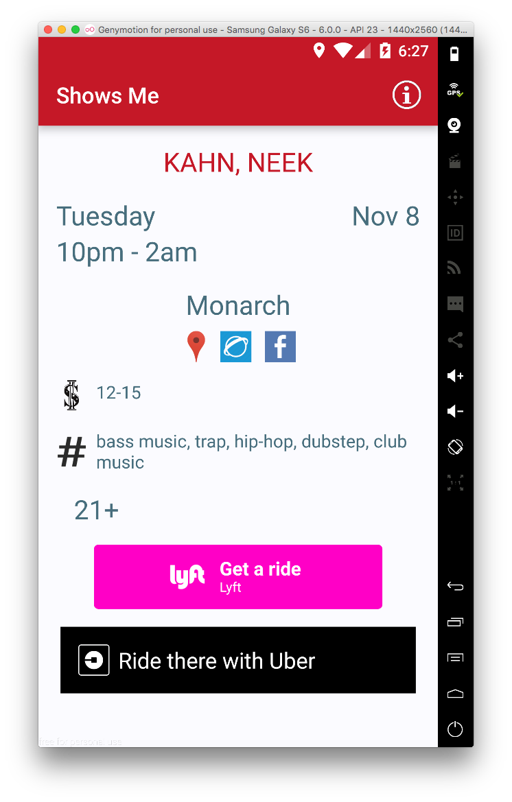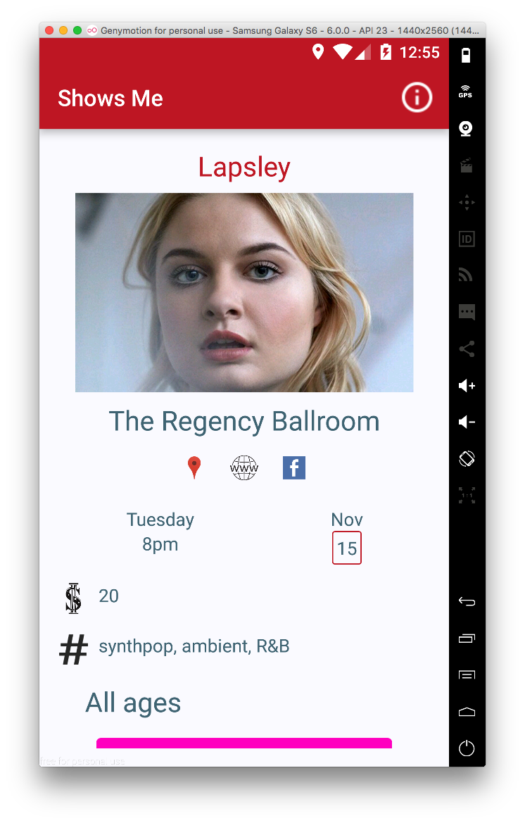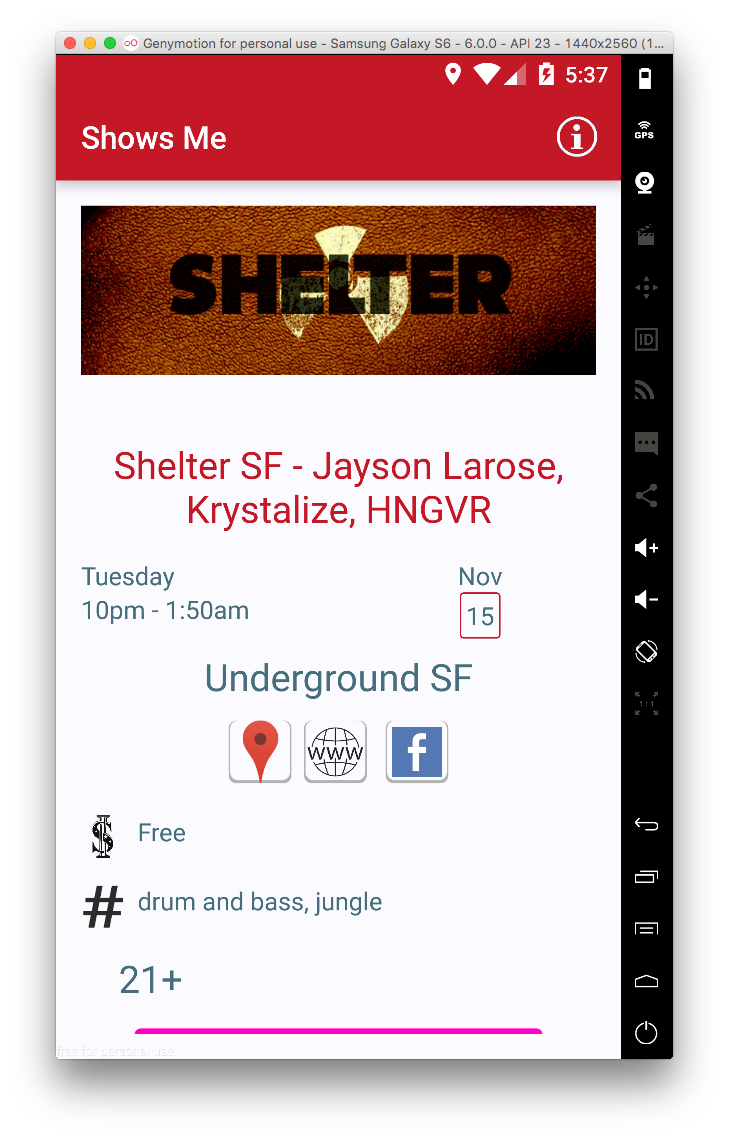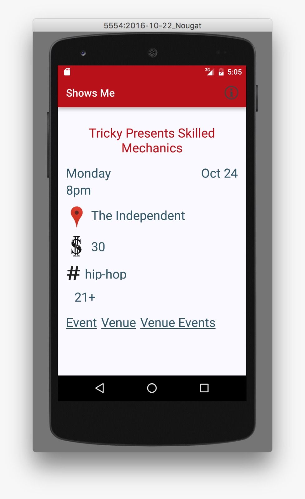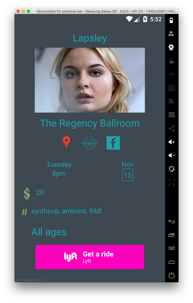 This time with a new outlook. First iteration listed musical events as well as streamed sample music by events' performing artists. I removed the exploratory streaming aspect of the app, and instead focused on event listing & helping the user get to an event.