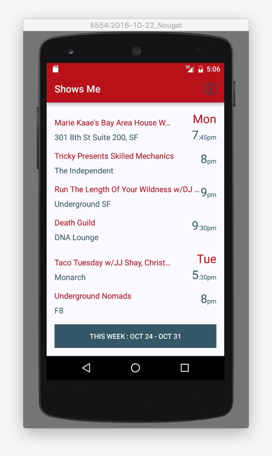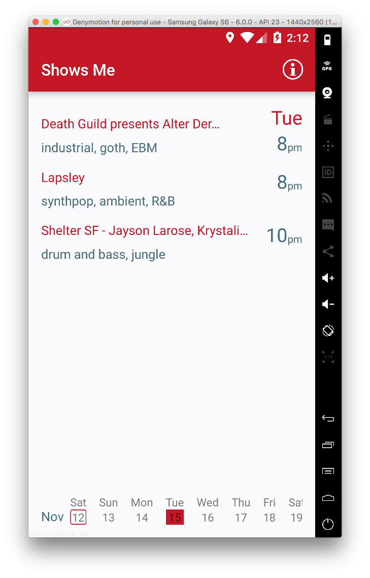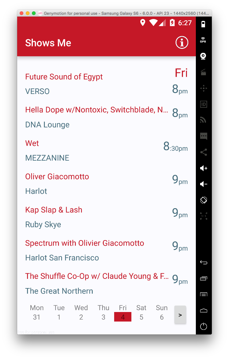 - Broke up events by this week vs next week. This was to eliminate the need for a date selector, while addressing the app’s main use case: “What’s going on this weekend?”
